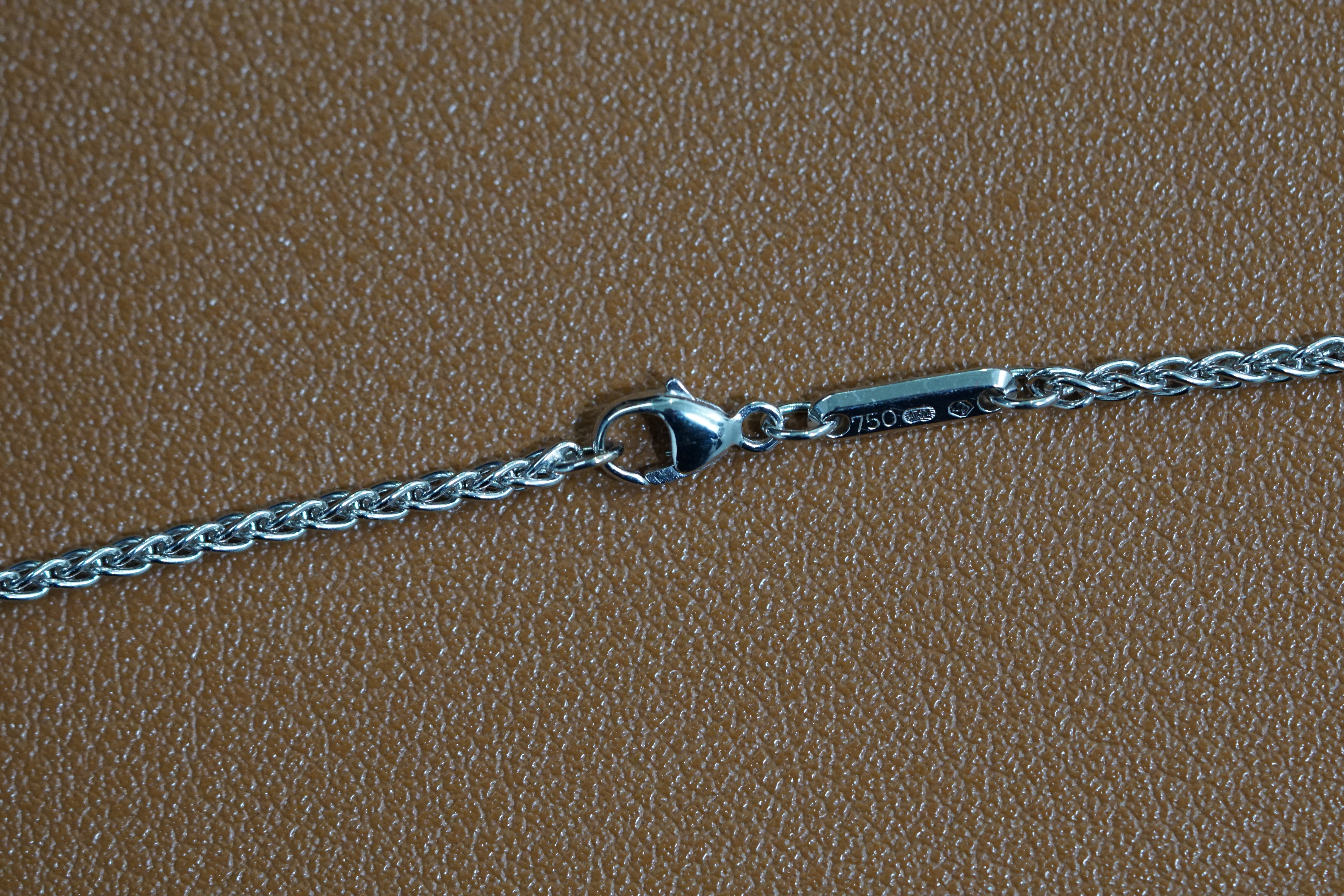 The Chopard Heart Happy Diamond Necklace is a stunning piece of fine jewellery made with 18K white gold. This elegant necklace features a heart-shaped pendant with round-cut diamonds, making it a perfect symbol of love. The necklace is hallmarked and has a sleek silver exterior, adding to its luxurious appeal. With a necklace length of 16.5 inches and a high-quality brand like Chopard, this piece is a timeless accessory for ladies who appreciate exquisite jewellery.