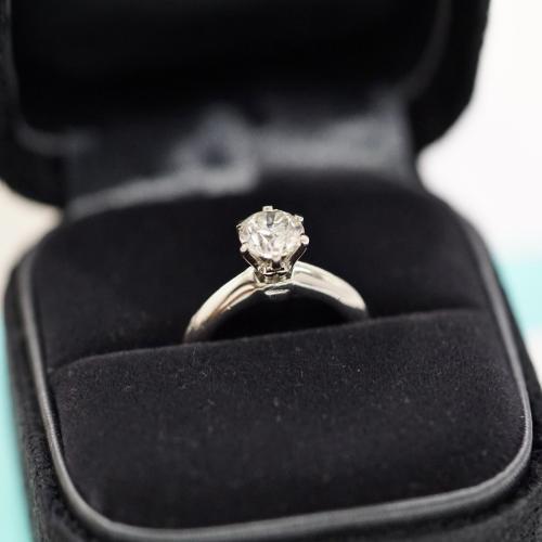 This Tiffany & Co 0.93ct I/VS1 XXX Diamond Solitaire Engagement Platinum Ring features a round white diamond with a colourless appearance, set in a platinum band with a knife edge design.